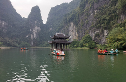 13:30 ā Leaving for the Trang An Grottoes, an out-standing natural beauty of majestic limestone massif at 20 square kilometer rise dramatically out from rice paddy fields. Deep into the linked chains of towering mountain are pristine places of mystical valleys, numerous fresh water ponds, and jungle.